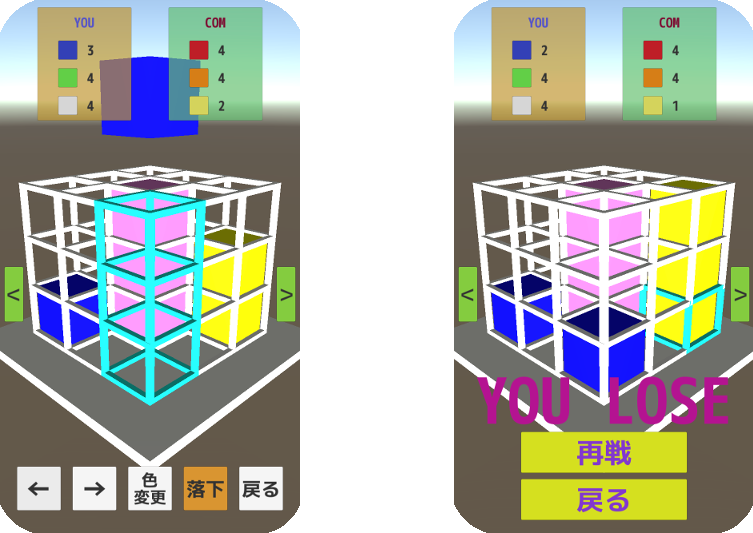 - 縦・横・ななめのいずれかで自身の持ち色のキューブの3連を作った方の勝利。